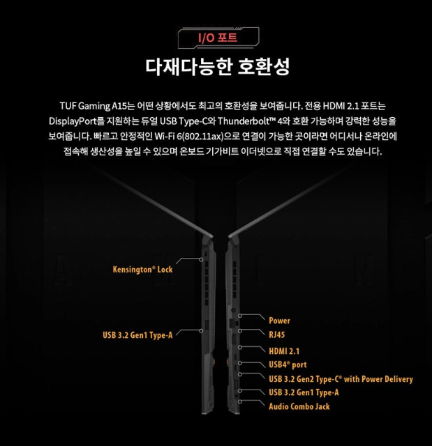 견고함과 스타일을 모두 갖춘 TUF Gaming A15는 야외 활동이나 이동이 잦은 게이머들에게도 신뢰를 제공합니다.