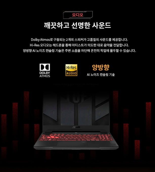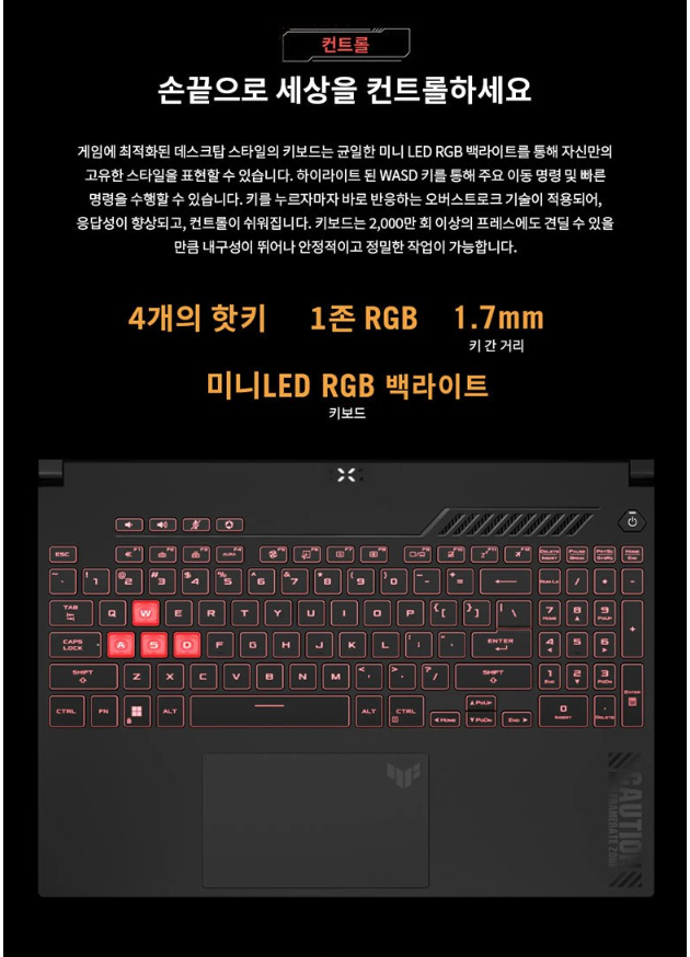 - 세련된 TUF 로고와 RGB 조명을 지원하는 키보드는 게이밍 감성을 더하며, 디자인적으로도 매력적입니다.