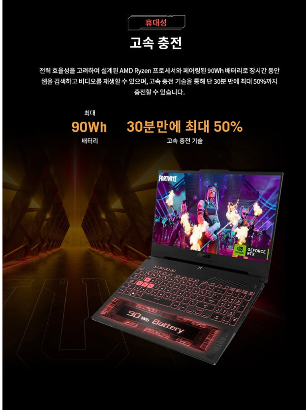 TUF Gaming A15는 90Wh 대용량 배터리를 탑재하여, 게이밍 노트북으로서는 준수한 배터리 수명을 제공합니다.