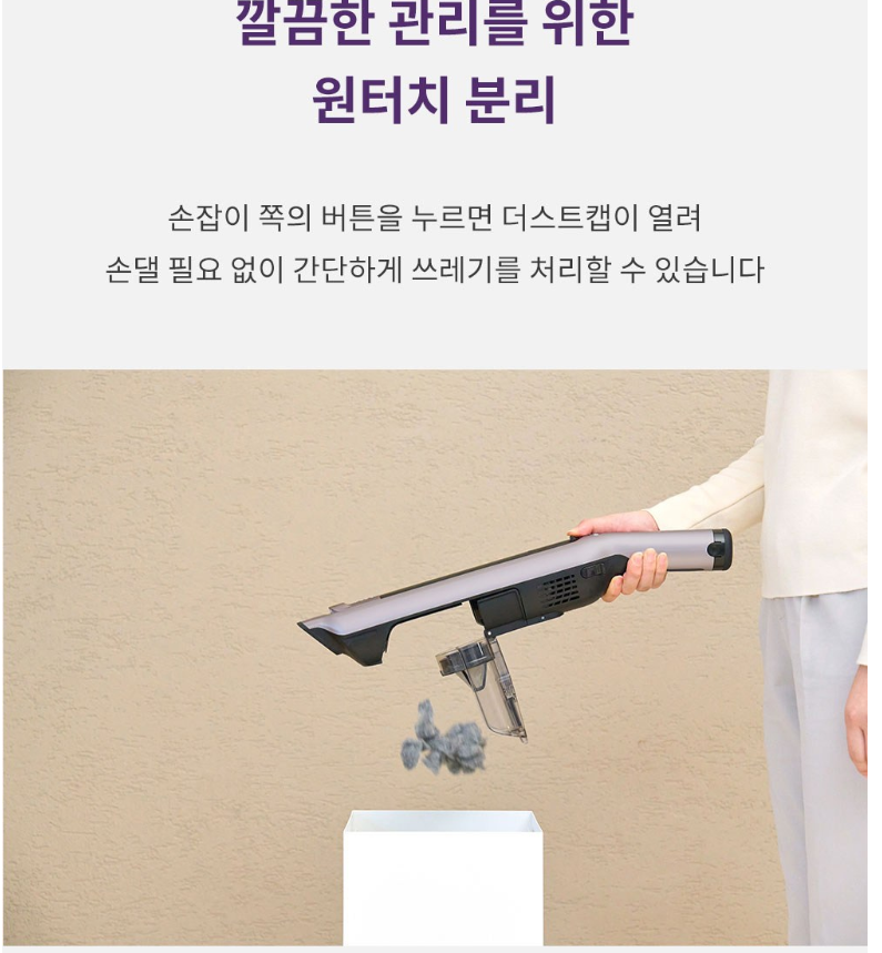 ✅ 원터치 먼지 배출 시스템: 먼지를 손에 묻히지 않고 간편하게 버릴 수 있음