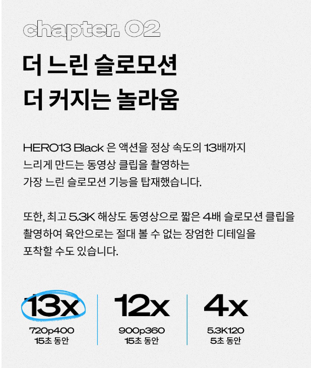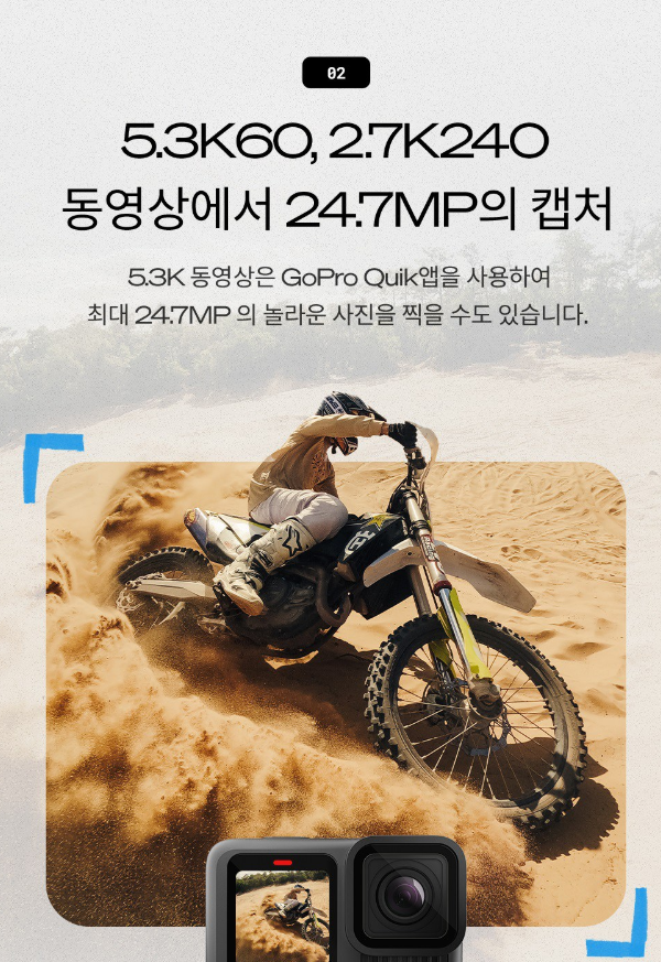 이 카메라는 5.3K 해상도에서 60fps로 비디오 촬영이 가능하며, 4K에서는 최대 120fps로 슬로모션 촬영이 가능합니다. 이러한 고화질 덕분에 매우 선명하고 생생한 영상을 제공합니다. 또한, 고프로의 새로운 이미지 프로세서를 통해 저조도 환경에서도 뛰어난 성능을 발휘합니다. HyperSmooth 5.0 안정화 기술은 매우 부드러운 비디오 촬영을 보장하며, 이는 액션 촬영에서 매우 중요한 특성입니다.
