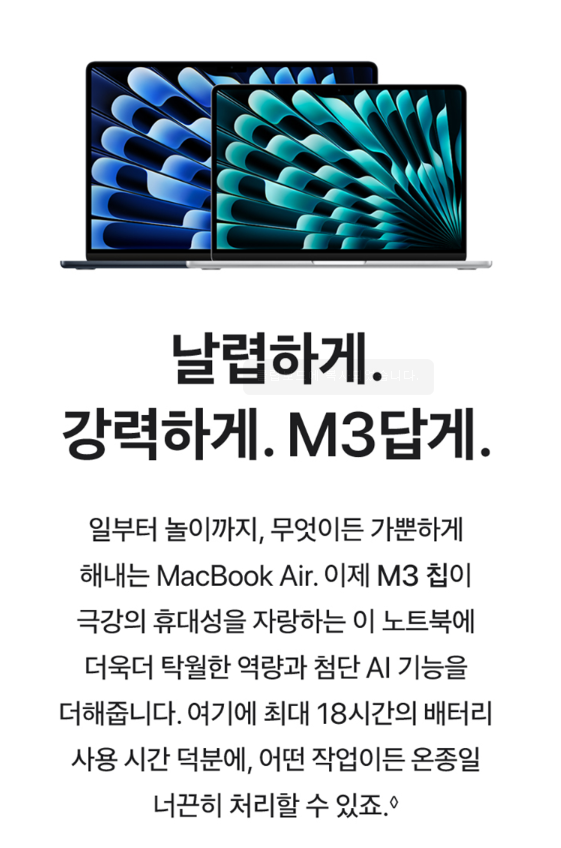 2024년 맥북에어 13 M3 모델은 Apple의 기술 혁신을 명확하게 보여주는 제품입니다. 슬림하고 가벼운 디자인, 강력한 성능, 장시간 지속되는 배터리, 그리고 뛰어난 디스플레이와 키보드는 이 노트북을 학생, 전문가, 그리고 모든 Apple 애호가들에게 완벽한 선택으로 만듭니다. 이 모델은 작업과 오락 모두를 한 차원 높은 수준으로 끌어올려 줄 것입니다.