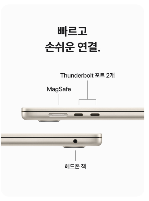 Apple의 2024년 맥북에어 13 M3 모델은 전작의 성공적인 디자인을 계승하면서도 몇 가지 중요한 개선을 통해 더욱 완벽한 사용자 경험을 제공합니다. 이 모델은 깔끔한 알루미늄 케이스와 함께 13.3인치의 Retina 디스플레이를 갖추고 있어, 얇고 가벼운 형태임에도 불구하고 뛰어난 내구성과 높은 휴대성을 자랑합니다. 무게는 약 1.29kg에 불과하며, 두께도 1.61cm로 매우 슬림하여 어디로든 쉽게 휴대할 수 있습니다.