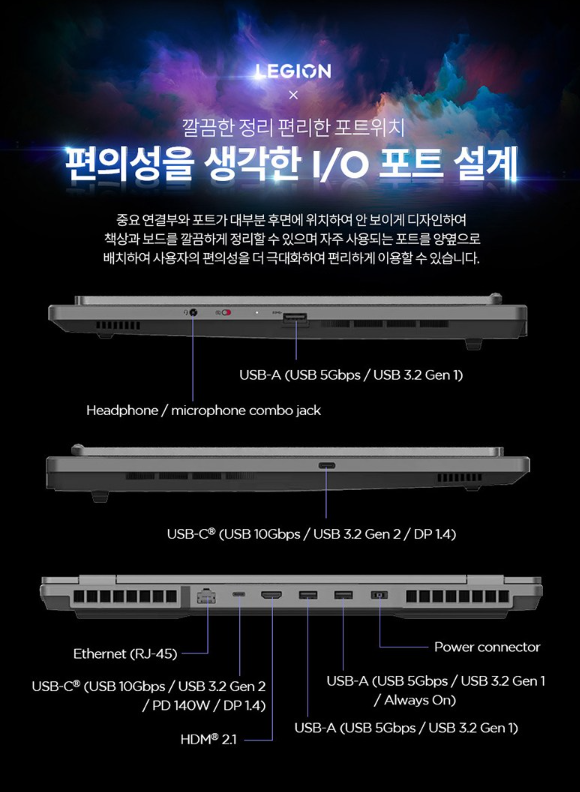 다양한 포트 옵션을 갖춘 리전 5i는 HDMI, USB-C, 그리고 여러 USB 3.1 포트를 제공하여 확장성이 뛰어납니다. 또한, 최신 Wi-Fi 6E와 Bluetooth 5.3은 빠르고 안정적인 무선 연결을 보장합니다. Nahimic 오디오 솔루션은 몰입감 있는 3D 사운드를 제공하여 게임과 멀티미디어 콘텐츠를 위한 완벽한 오디오 환경을 조성합니다.