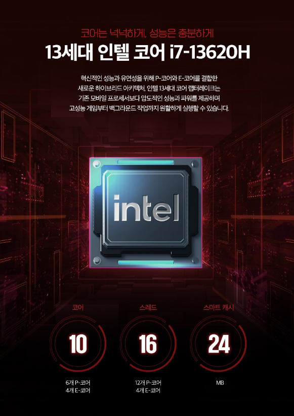 이 게이밍 노트북은 13세대 인텔 코어 i7 프로세서와 NVIDIA GeForce RTX 3060 그래픽 카드를 탑재하여 최상의 게임 플레이 성능을 제공합니다. 최대 32GB의 DDR4 메모리와 1TB NVMe SSD는 게임과 프로그램 로딩 시간을 혁신적으로 단축시켜 줍니다. 이 조합은 최신 AAA 게임들을 높은 설정에서도 부드럽게 실행할 수 있는 충분한 힘을 제공합니다.
