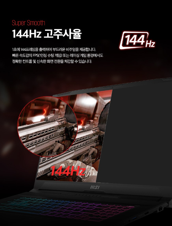 17.3인치 Full HD (1920x1080) 디스플레이는 최대 144Hz의 리프레시율을 지원하여 매우 부드러운 이미지를 제공합니다. 이는 빠른 속도의 게임에서도 깨끗하고 끊김 없는 시각적 경험을 가능하게 합니다. 또한, IPS 패널은 우수한 색상 정확도와 넓은 시야각을 제공하여 어느 각도에서도 완벽한 시청 경험을 보장합니다.