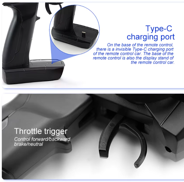 리모컨은 크기에 비해 다소 묵직한 편인데요, 이는 안정적인 조작감을 제공하기 위함으로 보입니다. 조이스틱의 반응 속도가 빠르고 정밀해서 작은 크기의 RC 자동차를 조종하는 데에도 어려움이 없습니다.