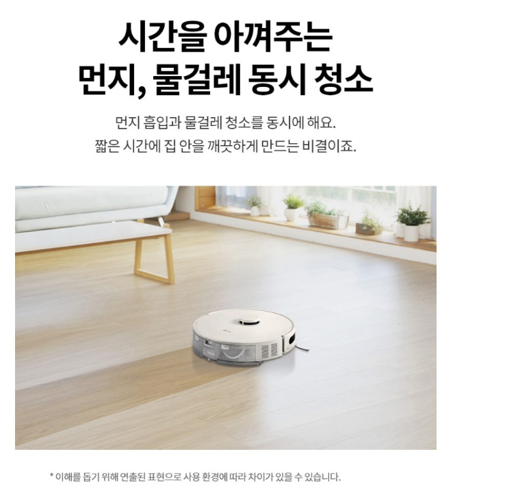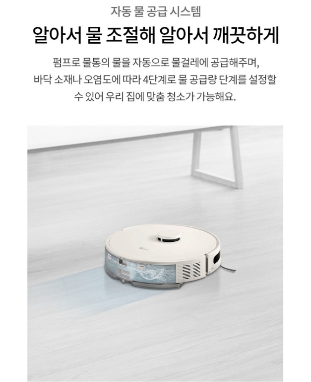 - 물걸레 청소: 자동으로 물의 양을 조절하여 바닥을 촉촉하게 닦아주며, 바닥 오염 정도에 따라 세척 강도를 조절할 수 있습니다.