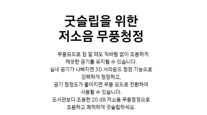 - 무풍 청정 모드 제공: 강한 바람 없이도 공기를 깨끗하게 정화