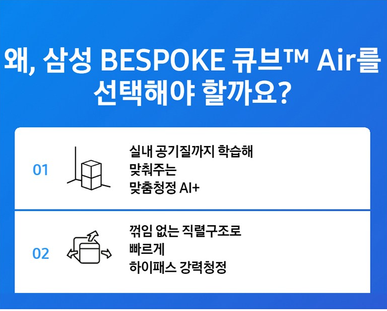 - 기능: AI 자동 운전, IoT 스마트싱스 연동, 무풍 청정, 맞춤형 BESPOKE 디자인