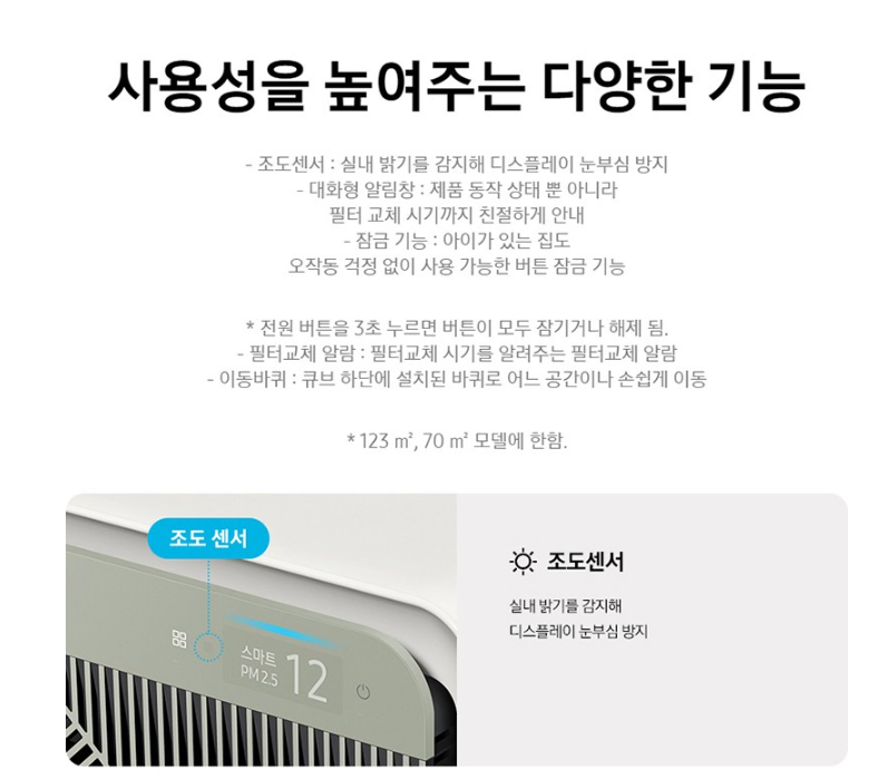 - 미세먼지 농도가 높을 때 자동으로 강풍 모드 전환