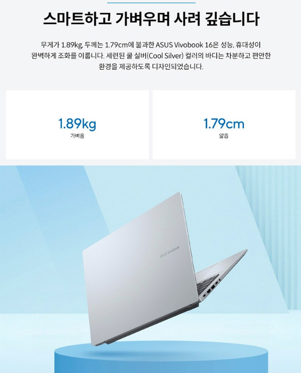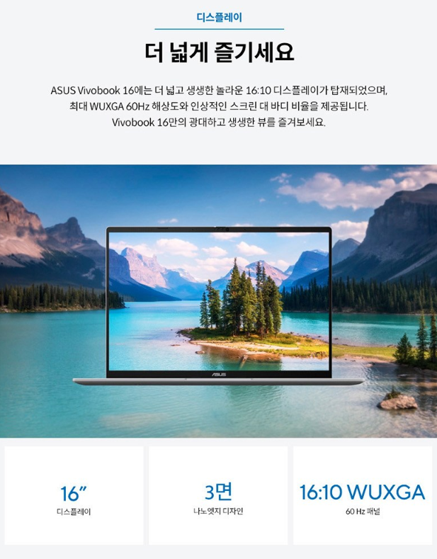 비보북 16은 슬림한 디자인과 알루미늄 마감으로 세련된 외관을 자랑합니다. 1.8kg의 가벼운 무게로 휴대성이 뛰어나며, 얇은 베젤을 적용하여 몰입감 있는 화면을 제공합니다.