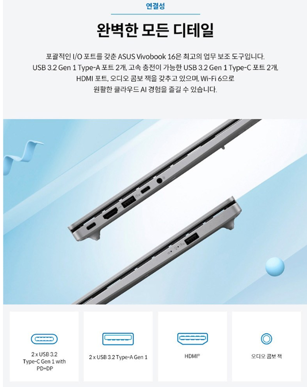 비보북 16은 가성비 좋은 다용도 노트북을 찾는 분들께 적합하며, 최신 코어 Ultra 5 프로세서 덕분에 미래지향적인 성능을 갖춘 점이 장점입니다.