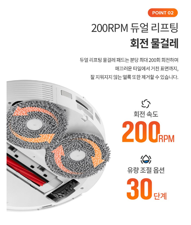 ✔ 듀얼 회전 물걸레 시스템 – 물걸레 자동 세척 및 건조 기능