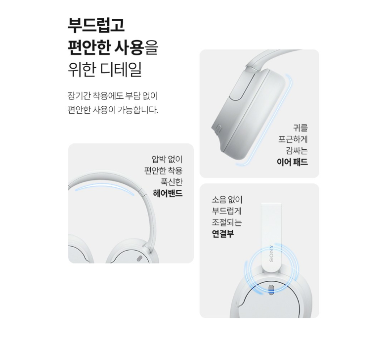 특히 WH-CH720N은 192g으로 소니 노이즈 캔슬링 헤드폰 중 가장 가볍고, 장시간 착용해도 부담이 적습니다. WH-1000XM5도 인체공학적인 디자인으로 편안한 착용감을 제공합니다.