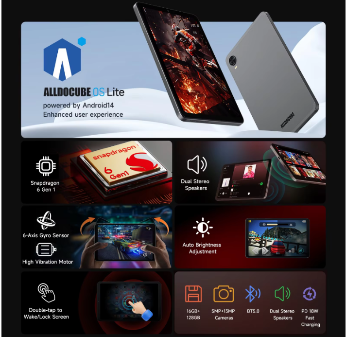 특히 Alldocube iPlay60 Mini Turbo는 8.4인치 디스플레이, 스냅드래곤 6 Gen 1 프로세서, 8GB(가상 8GB 추가) RAM, 128GB 저장공간, 안드로이드 14, Widevine L1 지원 등
