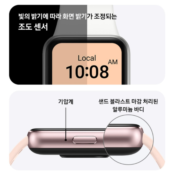 - 센서: 심박수, 혈중 산소 포화도(SpO2), 수면 모니터링, 가속도계, 자이로스코프