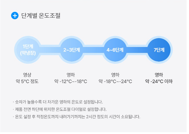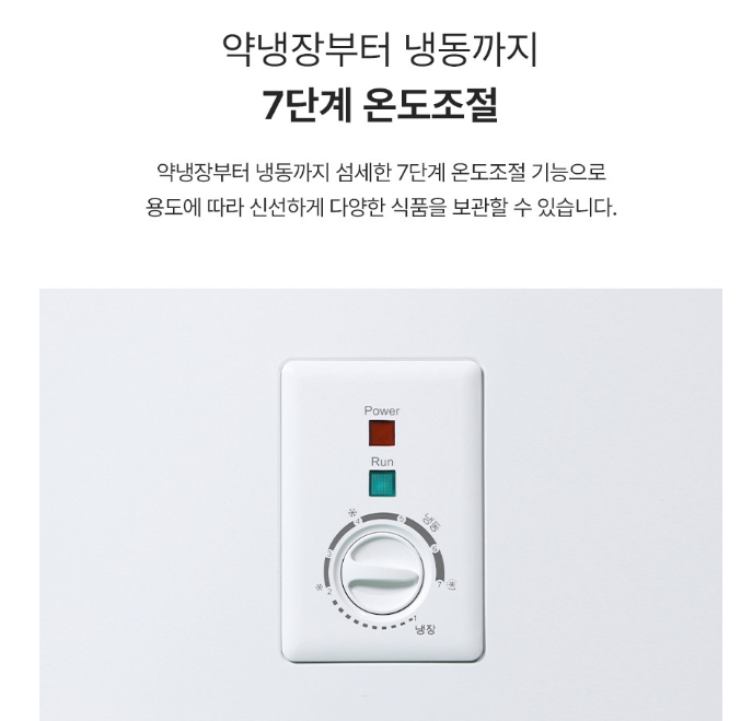온도 조절 다이얼은 1~7단으로, 냉동 강도를 환경에 따라 설정할 수 있어 전기세 걱정도 덜할 수 있었어요.
