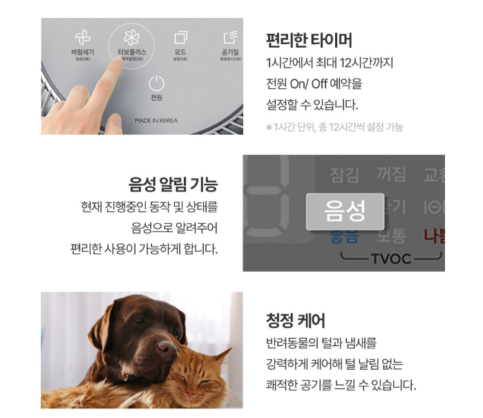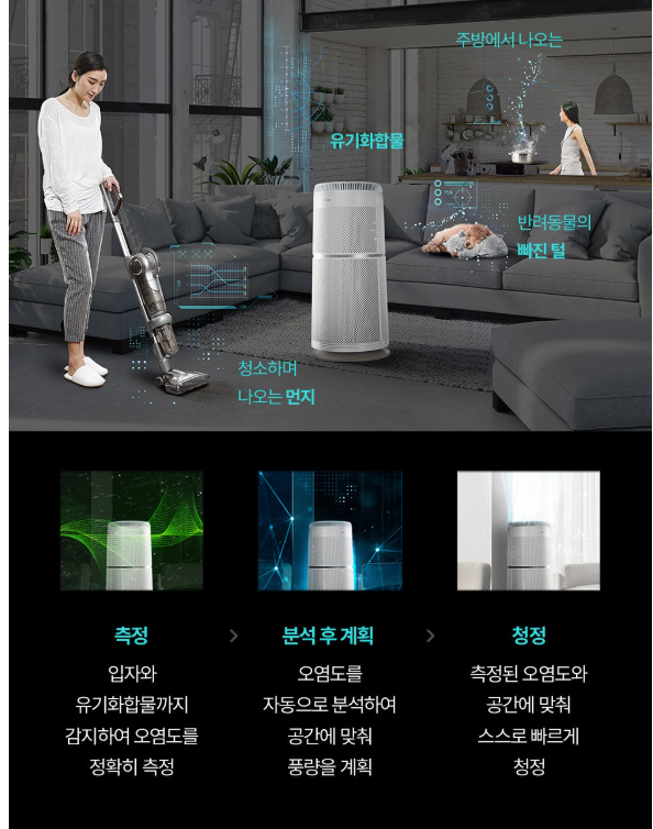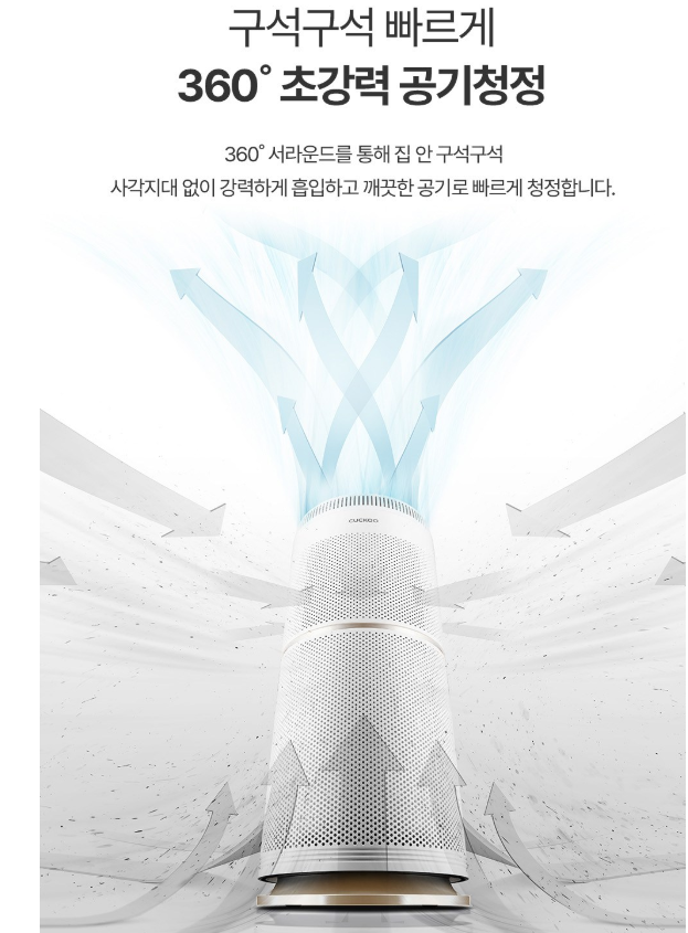 강력한 풍량과 입체 공기 순환 시스템으로, 공간 전체를 빠르고 균일하게 정화해주는 것이 큰 장점입니다.