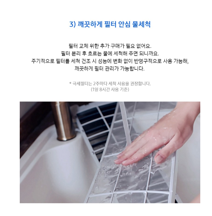 필터는 간편하게 탈부착 가능하며, 세척도 쉬워 위생적으로 관리할 수 있어요. 자동 건조 기능을 통해 내부 습기를 줄이고 곰팡이, 세균 번식도 방지할 수 있어 더 안심됩니다.