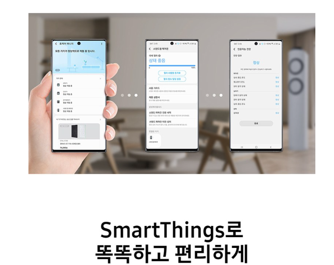 또한 스마트싱스(SmartThings) 연동이 가능해, 스마트폰으로 에어컨을 제어하고 전력 사용량까지 실시간으로 확인할 수 있어요. 외출 중에도 원격으로 전원을 켜놓고 귀가 전 시원한 집을 만들 수 있죠.