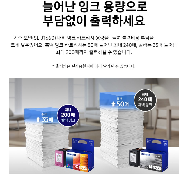 SL-J1680은 기존 모델 대비 잉크 카트리지 용량이 20% 이상 늘어나 경제성을 강화했습니다.