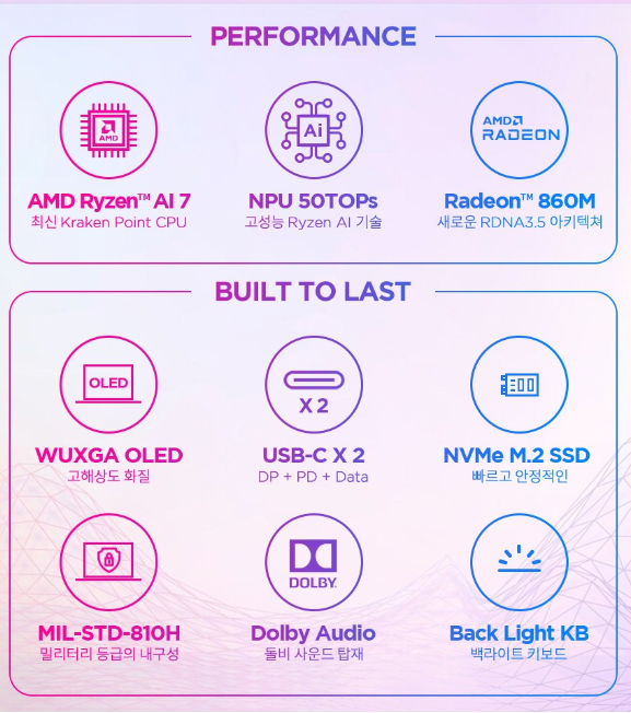 - CPU: AMD Ryzen AI 7 (라이젠 AI 300 시리즈)