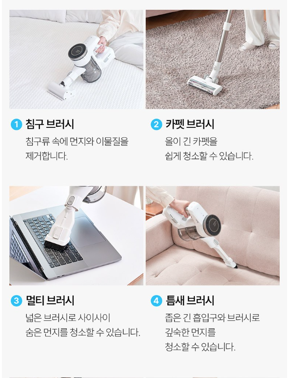 청소기 본체 외에 **3종 브러시(솔 브러시, 틈새 브러시, 소프트 롤러 브러시)**가 기본 제공됩니다. 저는 개인적으로 틈새 브러시가 아주 유용했어요. 침대 밑, 소파 사이, 창틀 구석구석 먼지를 흡입할 때 정말 도움이 되더라고요.