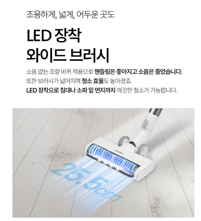 게다가 청소기 헤드에 LED 라이트가 달려 있어 어두운 곳까지 먼지를 놓치지 않고 확인할 수 있어서 만족도가 높았습니다.