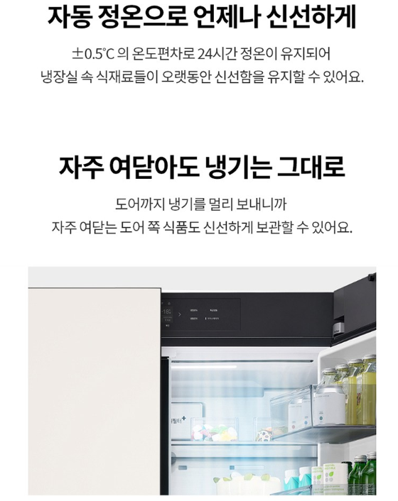 냉장고에서 놓치기 쉬운 부분이 바로 냄새 관리와 냉기 유지력인데요. 이 제품은 내부에 메탈 프레시 패널이 적용되어 냉기를 빠르게 순환시켜주고, 문을 열었다 닫았을 때도 온도 복원 속도가 빠릅니다.