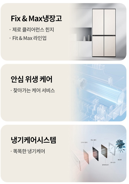 - 기능: 인버터 리니어 컴프레서 / 스마트 진단 / Wi-Fi 연동 / 메탈 프레시 / 탈취 시스템 등