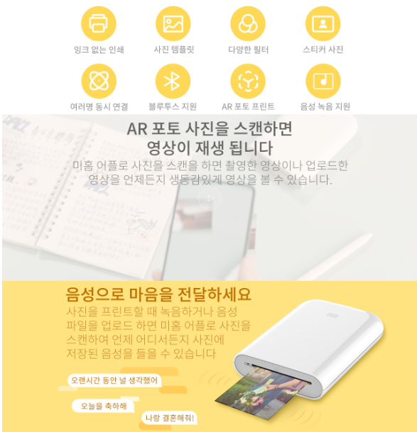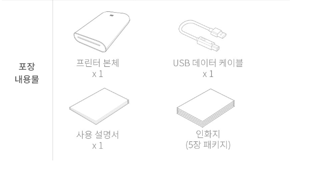 | 장점 | 무잉크 기술, 쉬운 연결, 스티커 출력, 감성 디자인, 전용 앱 편리 |