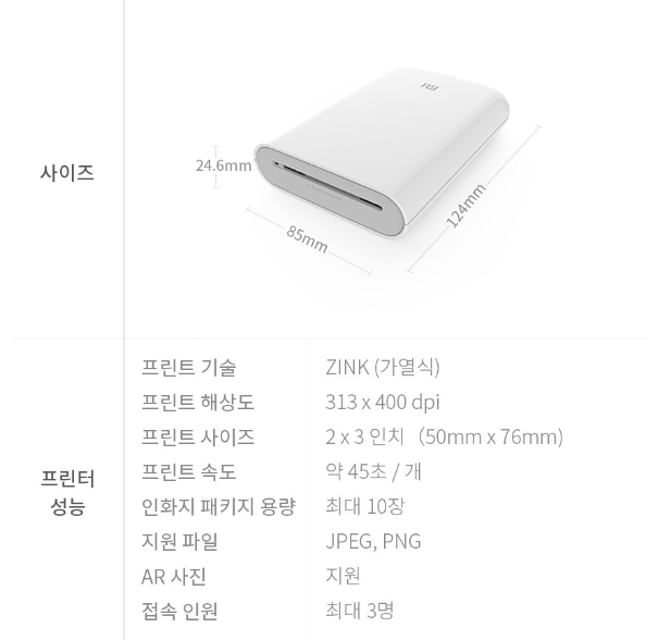 | 총평 | 감성 사진 출력에 최적화된 포토프린터. 가격 대비 만족도 높음 |