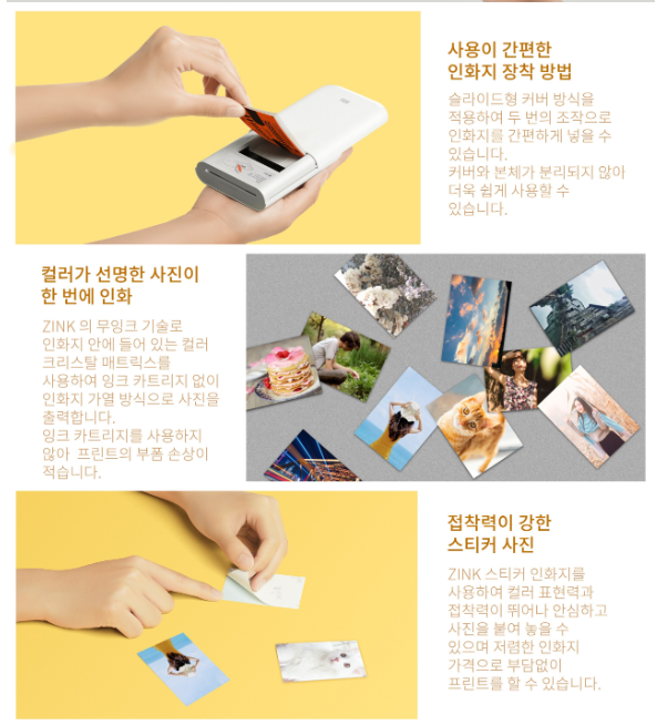 - 특징: 스티커형 포토용지, 무카트리지, 무소음 출력, 콤팩트 디자인