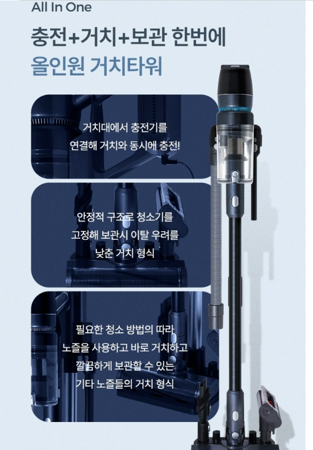 - 구성: 본체 + 자동충전 거치대 + 고사양 모터 + 휴대용청소기 증정
