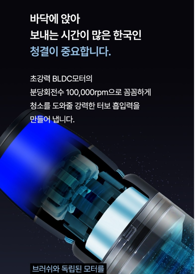 이 제품은 고성능 BLDC 모터를 탑재해, 일반 청소기 대비 1.5배 이상 강한 흡입력을 제공합니다.
