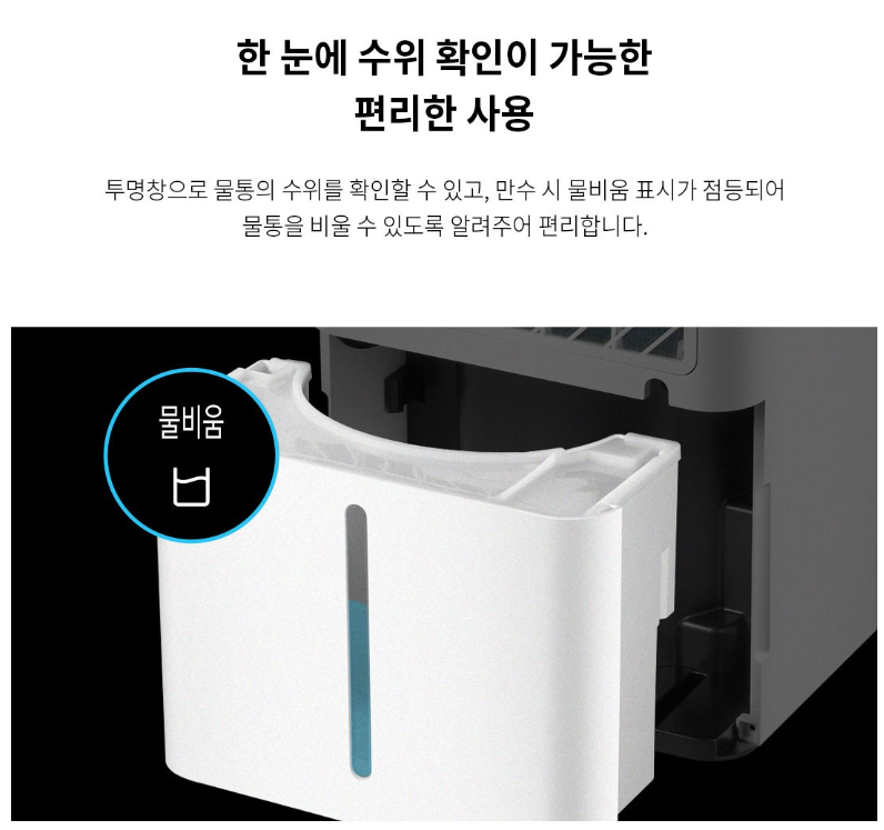 - 외부 수위창: 물통 수위를 외부에서 직접 확인 가능하여 효율적