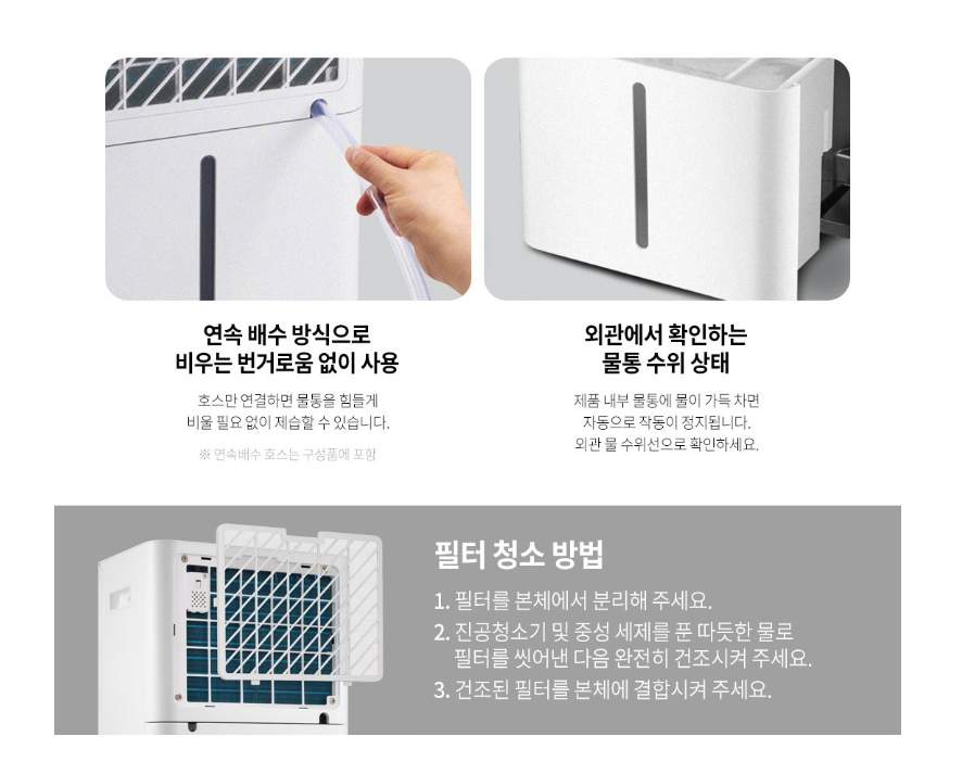 - 연속배수: 호스만 연결하면 자동 배출되어 물통 비울 필요 없이 장시간 운전 가능