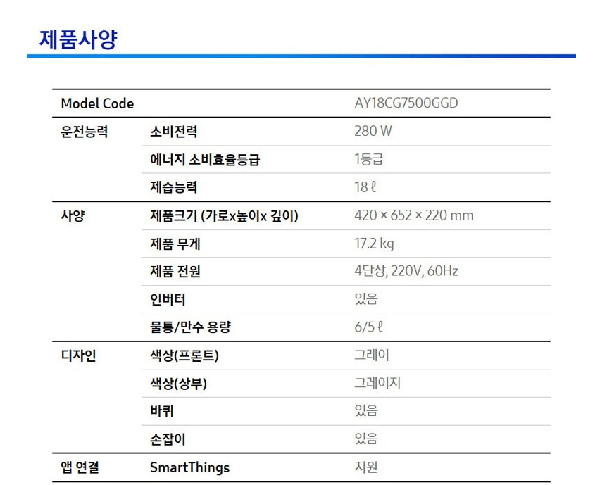 삼성의 최신 모델인 **삼성 인버터 제습기 18L (AY18CG7500GGD)**를 알게 되었어요.