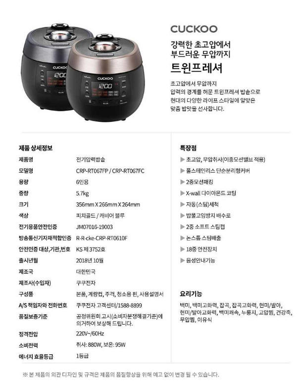 쿠쿠 트윈프레셔 밥솥 6인용 CRP-RT067FC바로가기