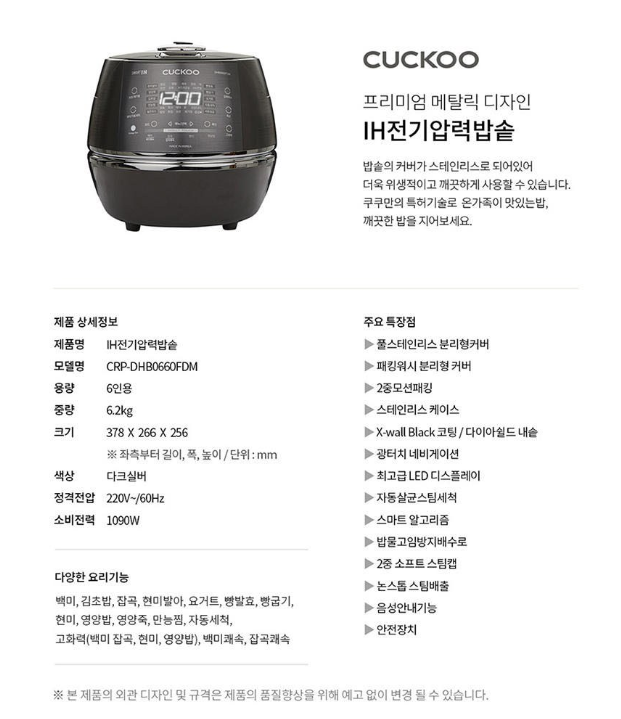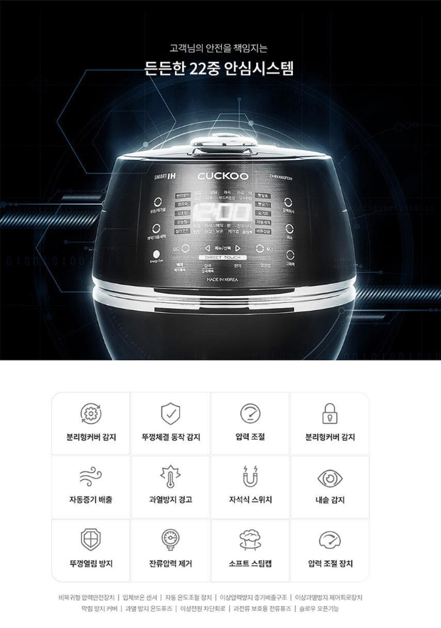 - 내구성: 쿠쿠 제품답게 튼튼한 내솥과 내구성을 보장하는 소재 사용으로 오랜 기간 사용 가능합니다.