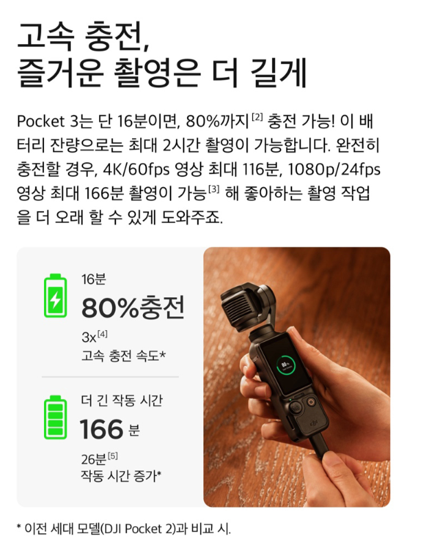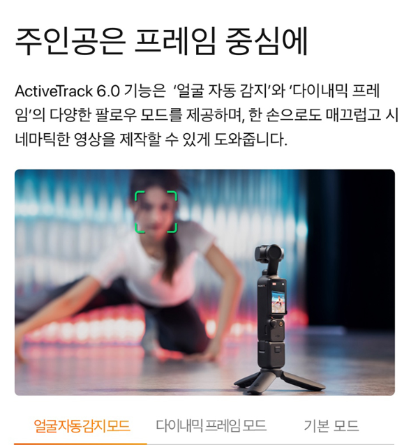타임랩스, 모션랩스, 패노라마 같은 다양한 촬영 모드도 지원하여, 사용자가 창의적인 촬영을 할 수 있도록 돕습니다. 또한, 터치스크린과 물리적 버튼이 결합된 인터페이스는 직관적이며 사용하기 쉽습니다. 추가로, 크리에이터 콤보 패키지에는 여러 추가 액세서리가 포함되어 있어, 더 다양한 촬영 요구를 충족시킬 수 있습니다.