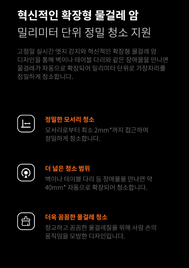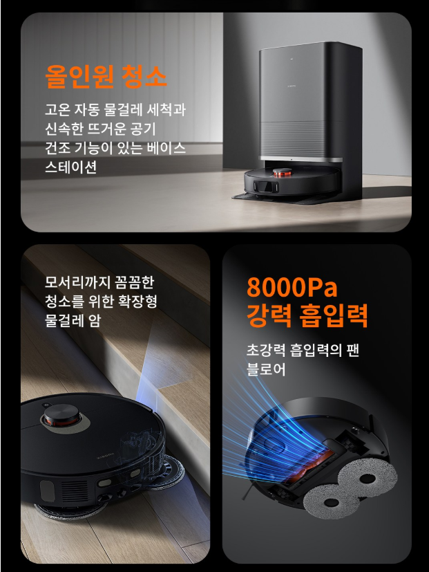 샤오미 X20 Max는 강력한 흡입력을 제공하며, 다양한 바닥 타입에서 효과적으로 먼지와 오염물을 제거합니다. 이 로봇 청소기는 최대 4000Pa의 흡입력을 자랑하며, 미세 먼지부터 큰 입자의 오염물까지 효과적으로 청소할 수 있습니다. 또한, 다중 브러시 시스템이 탑재되어 있어, 모서리와 벽 가까이의 먼지도 놓치지 않고 청소합니다.